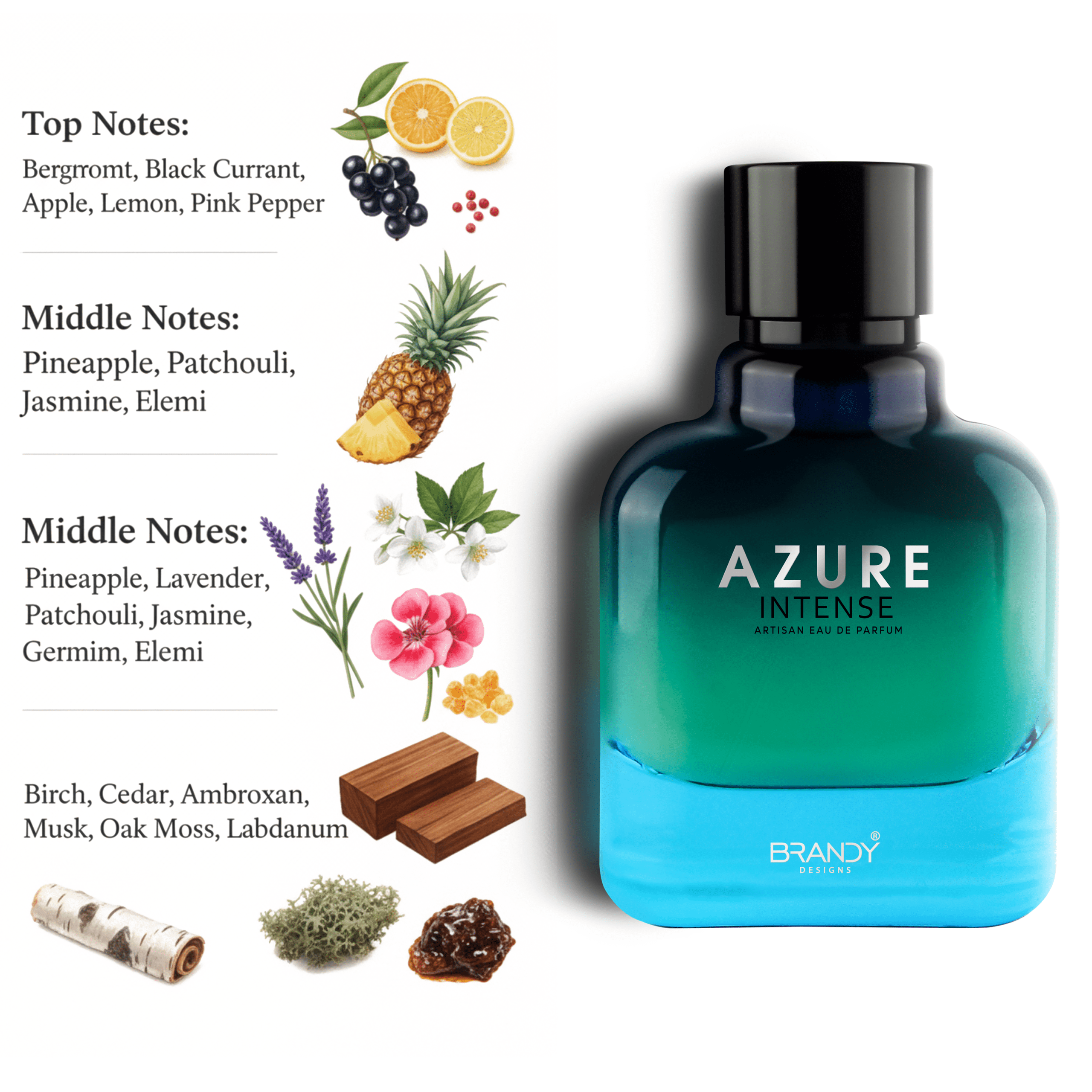 Middle Notes: Pineapple , Lavender, Patchouli , Jasmine , Geranium , Elemi