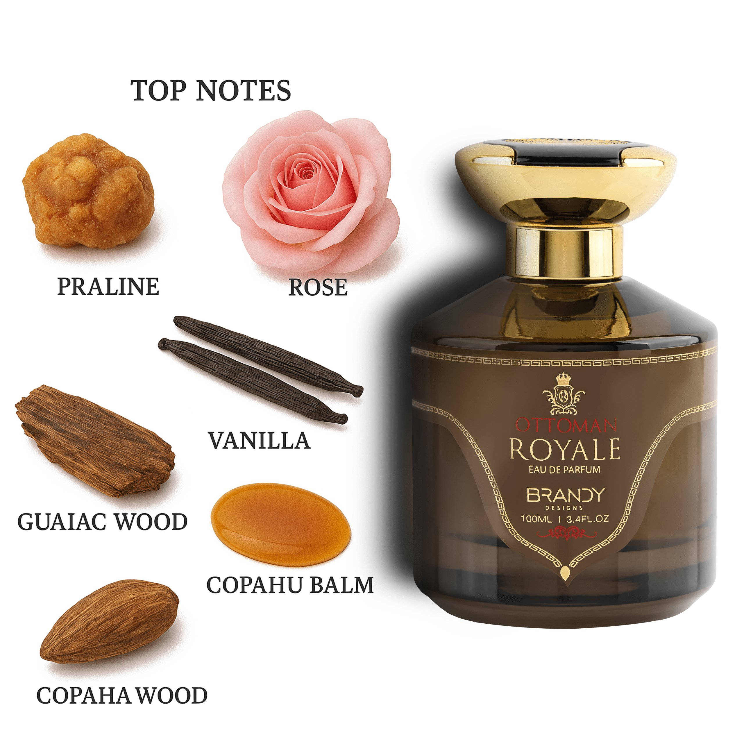 Top Notes: Praline, Agarwood (Oud), Rose, Vanilla, Guaiac, Wood, Copahu Balm