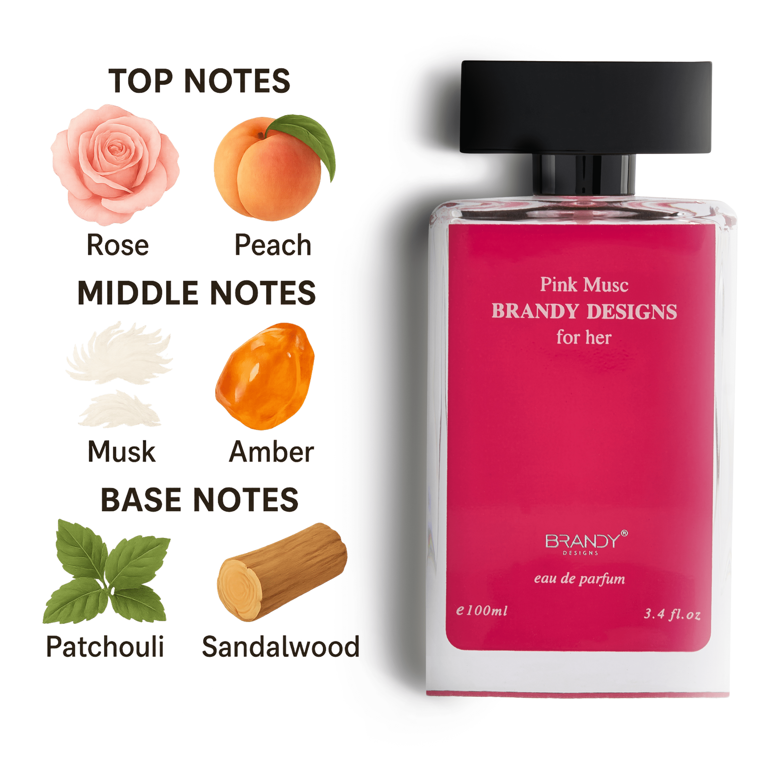 The delightful opening of peach is beautifully balanced by the floral nuances of rose. As the fragrance settles, warm undertones of musk, amber, patchouli, and sandalwood emerge, adding depth and sophistication to the overall experience.